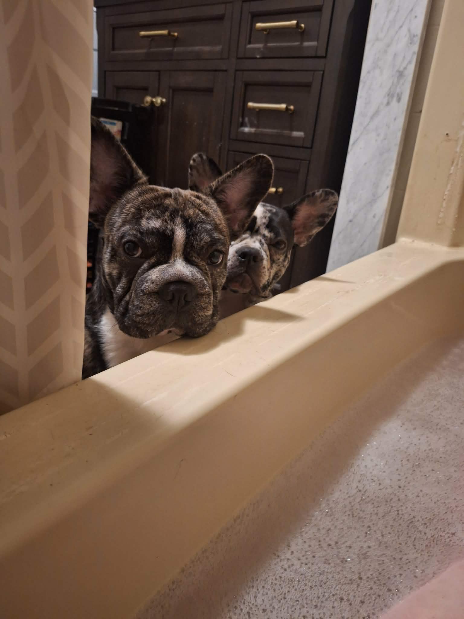 Privacy? What's that? These two have appointed themselves as my personal bathroom attendants. I can't take a shower without supervision, can't brush my teeth without an audience, and forget about having a peaceful bath.