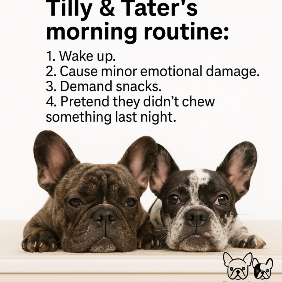 That's when Tater decided the couch pillow needed to be "hunted." You know that thing dogs do where they grab a pillow and shake it like they're conquering a wild beast? Yeah, that. Stuffing everywhere. Tilly immediately joined in because, obviously, if one Frenchton is destroying something, the other needs to help.